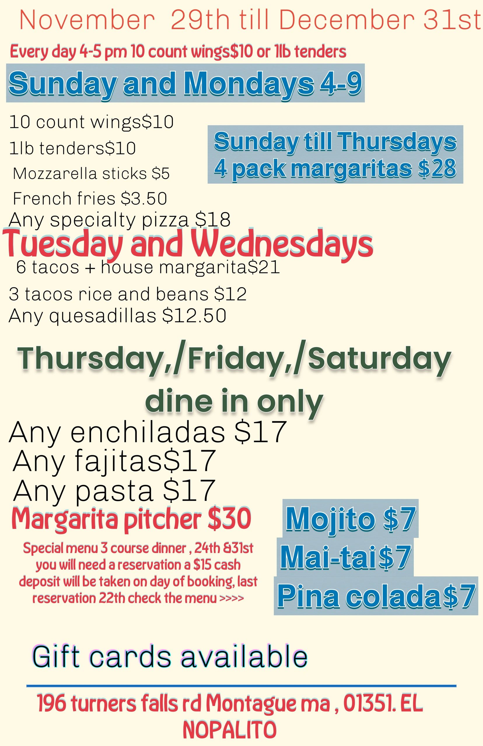 El Nopalito Montague has been serving authentic Mexican cuisine New York style pizzeria since 2022 , family friendly, all welcome, margaritas $8 sm $9 lg add any flavor, we work everyday to best serve our Community, welcome everyone to EL NOPALITO FAMILY .